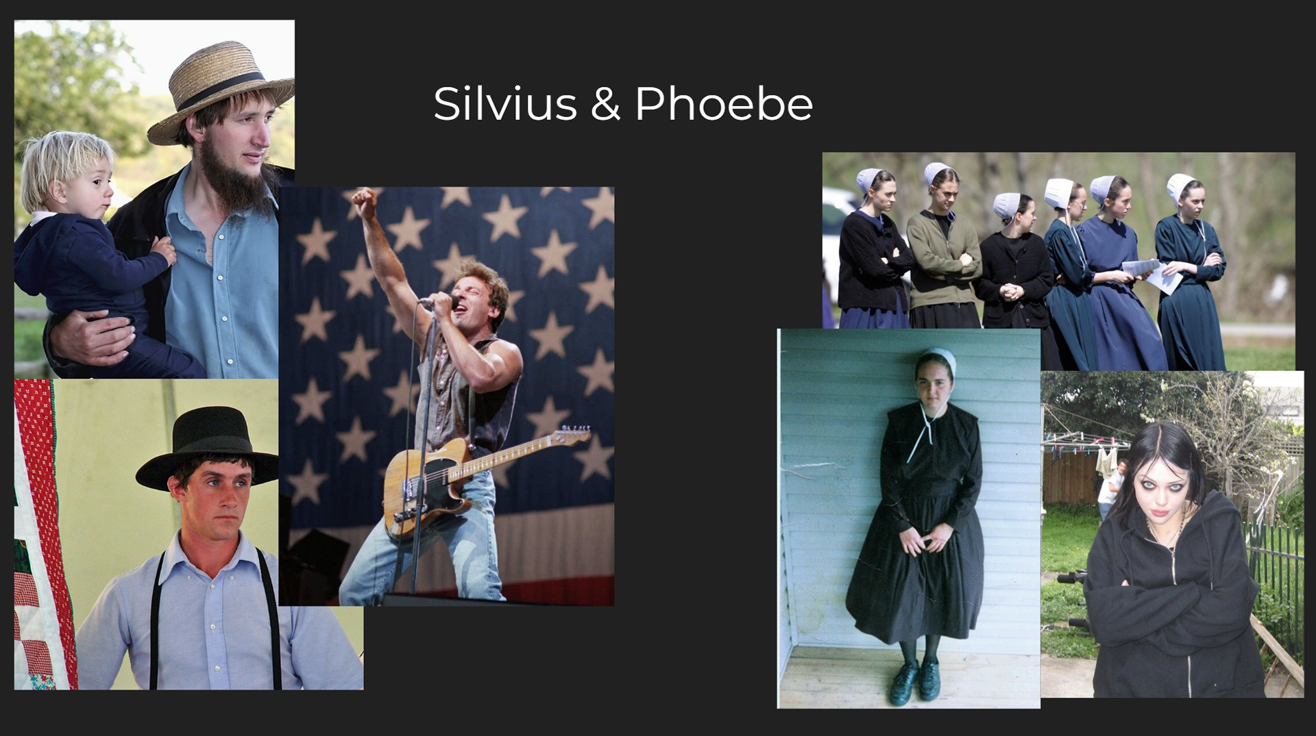 Shakespeare's As You Like It, but make it Jersey? And Amish? This was the initial concept for As Youse Like It, where the mob family of Duke Frederick and the world of the Pennsylvania Amish collide. Also taking inspiration from Bruce Springsteen songs, the production is a high-spirits musical with montages, full song-and-dance numbers, and harmonica solos. It was important to capture the show's humor and to translate the many script changes we made into my designs. For example, Touchstone was genderbent, so we made her the modern maid of the de Boys' house. Similarly, Le Beau was changed to La Beau, and the smaller roles such as Hymen and Sir Martext became her many disguises.